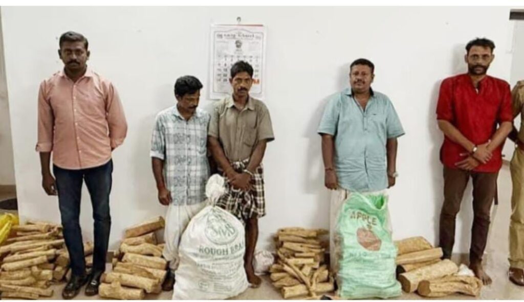 കൊല്ലം സ്വദേശികളായ ഷെഫീക്, നബീബ്, തമിഴ്നാട് സ്വദേശി നെഹേമി, നെയ്യാറ്റിൻകര സ്വദേശി ബിജു കുമാർ എന്നിവരാണ് അറസ്റ്റിലായത്. കഴിഞ്ഞ ദിവസമാണ് സംഭവം നടന്നത്. കോവളം സമുദ്ര ബീച്ചിന് സമീപത്ത് വെച്ച് ചന്ദനമുട്ടികൾ കൈമാറുന്നതിനിടയിലായിരുന്നു അന്വേഷണ സംഘം ഇവരെ പിടികൂടിയത്.