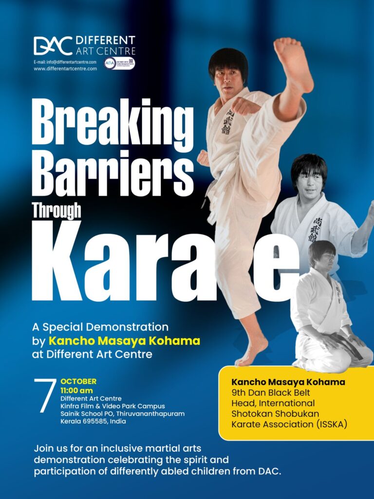 ഇതിനോടനുബന്ധിച്ച് പ്രത്യേക കരാട്ടെ പ്രദര്ശനവും നടക്കും. ഇതാദ്യമായാണ് ഡിഫറന്റ് ആര്ട് സെന്ററില് കരാട്ടെ പരിശീലന പദ്ധതിക്ക് തുടക്കം കുറിക്കുന്നത്. ഭിന്നശേഷിക്കുട്ടികളുടെ കായിക സമഗ്ര പുരോഗതിക്കായി നിരവധി കായിക ഇനങ്ങള് പരിശീലിപ്പിക്കുന്നുണ്ട്.