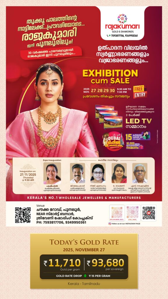 തിരുവനന്തപുരം: പുനലൂരിൽ പൊൻ പകിട്ടേകാൻ രാജകുമാരിയുടെ തൂവൽ സപ്ർശം. രാജകുമാരി ഗ്രുപ്പ് സംഘടിപ്പിക്കുന്ന പുനലൂർ എക്സിബിഷൻ കം സെയിലിന് വൻ ജനപങ്കാളിത്തത്തോടെ തുടക്കം കുറിച്ചു. എക്സ്പോ ഉദ്ഘാടനം പുനലൂർ നഗരസഭ ചെയർപേഴ്സൺ പുഷ്പലത നിർവഹിച്ചു.