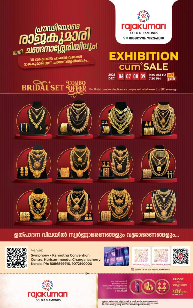 മലയാളികളുടെ സ്വർണ്ണാഭരണ രംഗത്തെ സ്വപ്നങ്ങൾക്ക് ചാരുതയേകിയ രാജകുമാരി ഗ്രുപ്പിൻ്റെ ഗോൾഡ് എക്സിബിഷൻ കം സെയിൽ ഡിസംബർ 6 മുതൽ 9 വരെയാണ് സംഘടിപിച്ചിട്ടുള്ളത്.രാജ്യത്തിൻ്റെ വിവിധ സംസ്ഥാനങ്ങളിലെ സ്വർണ്ണാഭരണങ്ങൾ ഹോൾസെയിൽ വിലയിൽ സ്വന്തമാക്കാൻ ഒരു സുവർണ്ണാവസരമാണ് ഇവിടെ ഒരുക്കിയിട്ടുള്ളത്.