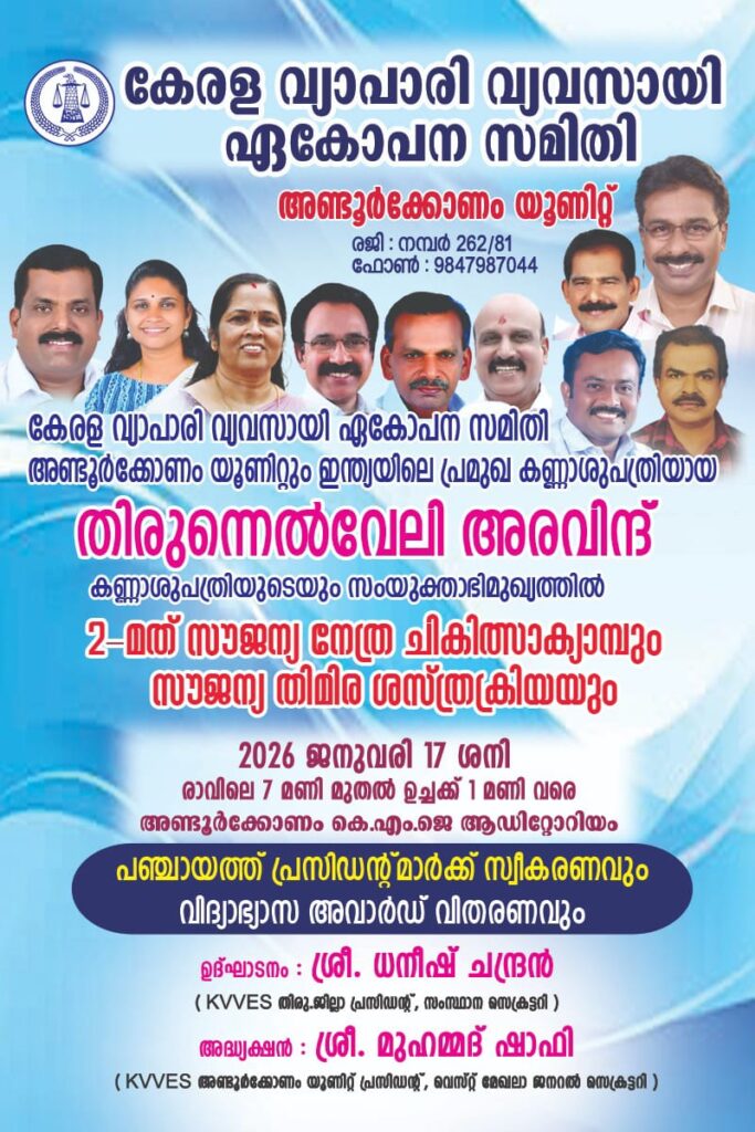 തിരുവനന്തപുരം: കേരള വ്യാപാരി വ്യവസായി ഏകോപന സമിതി അണ്ടൂർക്കോണം യൂണിറ്റും ഇന്ത്യയിലെ പ്രമുഖ കണ്ണാശുപത്രിയായ തിരുന്നെൽവേലി അരവിന്ദ് കണ്ണാശുപത്രിയുടെയും സംയുക്താഭിമുഖ്യത്തിൽ 2-മത് സൗജന്യ നേത്ര ചികിത്സാക്യാമ്പും സൗജന്യ തിമിര ശസ്ത്രക്രിയയും സംഘടിപ്പിക്കുന്നു. നാളെ രാവിലെ 7 മണി മുതൽ ഉച്ചക്ക് 1 മണി വരെ അണ്ടൂർക്കോണം കെ.എം.ജെ ആഡിറ്റോറിയത്തിൽ വച്ചാണ് ക്യാമ്പ് സംഘടിപ്പിക്കുന്നത്.