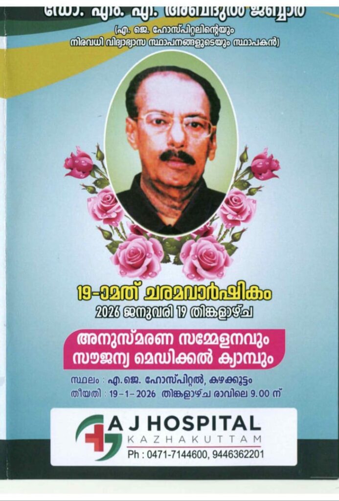 നാളെ നടക്കുന്ന അനുസ്മരണ സമ്മേളനത്തിന് ശേഷം സൗജന്യ മെഡിക്കൽ ക്യാമ്പും സംഘടിപ്പിക്കുന്നുണ്ട്. കഴക്കൂട്ടം എ.ജെ. ഹോസ്പിറ്റിൽ വച്ചാണ് മെഡിക്കൽ ക്യാമ്പ് സംഘടിപ്പിക്കുന്നത്. മെഡിക്കൽ ക്യാമ്പിൽ പങ്കെടുക്കുന്നതിന് നാളെ രാവിലെ 09.മണി വരെ നേരിട്ടും, ഫോണിലൂടെയും രജിസ്റ്റർ ചെയ്യാവുന്നതാണ്.