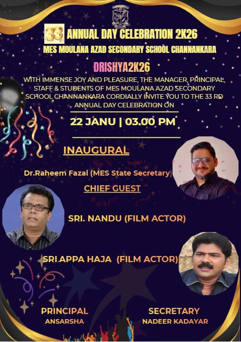 തിരുവനന്തപുരം: ചാന്നങ്കര എംഇഎസ് മൗലാന ആസാദ് സെക്കൻഡറി സ്കൂൾ വാർഷികം നാളെ. 33-ാമത് വാർഷികാഘോഷമാണ് DRISHYA2K26 എന്ന പേരിൽ നാളെ അരങ്ങേറുന്നത്. ചലച്ചിത്ര നടന്മാരായ നന്ദു, അപ്പ ഹാജ എന്നിവർ വിശിഷ്ടതിഥികളായി പങ്കെടുക്കും.