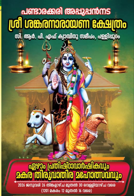 തിരുവനന്തപുരം: പള്ളിപ്പുറം പണ്ടാരക്കരി അപ്പുപ്പൻനട ശ്രീ ശങ്കരനാരായണ ക്ഷേത്രത്തിലെ ഏഴാം പ്രതിഷ്ഠാവാർഷികവും മകര തിരുവാതിര മഹോത്സവവും ജനുവരി 26 മുതൽ ആരംഭിക്കും. അഞ്ചു ദിവസം നീണ്ടു നിൽക്കുന്ന ഉത്സവമാണ് നടക്കുക. പണ്ടാരക്കരി അപ്പുപ്പൻനട ശ്രീ ശങ്കരനാരായണ ക്ഷേത്രത്തിലെ ഏഴാം പ്രതിഷ്ഠാ വാർഷികവും മകര തിരുവാതിര തൃക്കൊടിയേറ്റ് മഹോത്സവവും 2026 ജനുവരി 26 തിങ്കളാഴ്ച മുതൽ 30 വെള്ളിയാഴ്ച വരെ ഭക്തിനിർഭരവും പൂർവ്വാചാര പ്രകാരമുള്ള ക്ഷേത്രാചാരവും അനുഷ്ഠാനങ്ങളും അന്നദാനം, സമൂഹപൊങ്കാല, വിവിധ കലാപരിപാടികൾ, കുലയെടുപ്പ് ഘോഷയാത്ര എന്നിവയുടെ അകമ്പടിയോടെ നടത്തും.