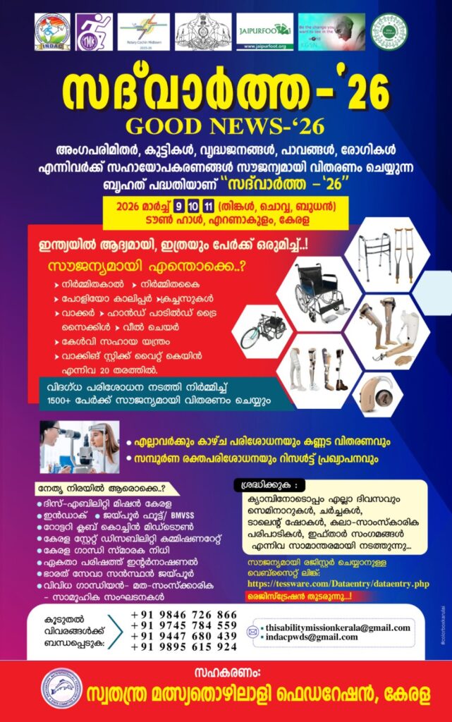 അംഗപരിമിതർ, കുട്ടികൾ, വൃദ്ധജനങ്ങൾ, പാവങ്ങൾ, രോഗികൾ എന്നിവർക്കായി സൗജന്യ സഹായോപകരണങ്ങൾ വിതരണം ചെയ്യുന്ന വലിയ സംരംഭമാണ് “സദ്വാർത്ത 26”. ഈ മഹാപദ്ധതി മാർച്ച് 9, 10, 11 തീയതികളിൽ എറണാകുളം ടൗൺ ഹാളിൽ വെച്ച് നടക്കും. ഇന്ത്യയിൽ ആദ്യമായി ഇത്രയും പേർക്ക് ഒരുമിച്ച് സേവനങ്ങൾ നൽകുന്ന ബൃഹത് പദ്ധതിയാണിതെന്ന് സംഘാടകർ അറിയിച്ചു.