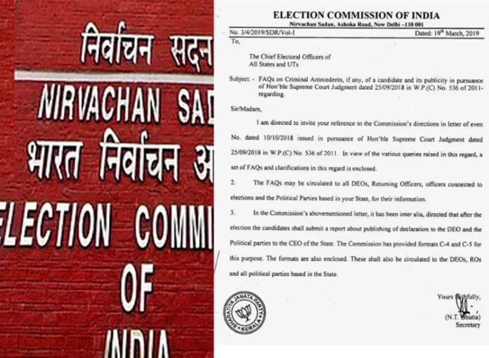 സ്ഥാനാര്ത്ഥികളുടെ ക്രിമിനല് പശ്ചാത്തലം സംബന്ധിച്ച 2019-ലെ മാര്ഗ്ഗനിര്ദ്ദേശങ്ങളില് വ്യക്തത തേടി ബിജെപി സംസ്ഥാന ഘടകം സിഇഒ ഓഫീസിനെ സമീപിച്ചിരുന്നു. ഇതിനായി അവര് സമര്പ്പിച്ച അപേക്ഷയ്ക്കൊപ്പം വെച്ചിരുന്ന 2019-ലെ കത്തിന്റെ പകര്പ്പിലാണ് ബിജെപിയുടെ സീല് ഉണ്ടായിരുന്നത്. ബിജെപി നല്കിയ ഈ കത്താണ് അശ്രദ്ധമൂലം മറ്റ് രാഷ്ട്രീയ പാര്ട്ടികള്ക്കും അയച്ചു കൊടുക്കുകയാണുണ്ടായതെന്നാണ് രത്തന് യു ഖേല്ക്കര് പറയുന്നത്. മാര്ച്ച് 21-ന് തന്നെ ഈ പിശക് ശ്രദ്ധയില്പ്പെട്ടതായും ഉടന് തന്നെ ആ നിര്ദ്ദേശം പിന്വലിച്ച് എല്ലാ പാര്ട്ടികള്ക്കും ജില്ലാ കളക്ടര്മാര്ക്കും അറിയിപ്പ് നല്കിയതായും കമ്മീഷന് അറിയിച്ചു.