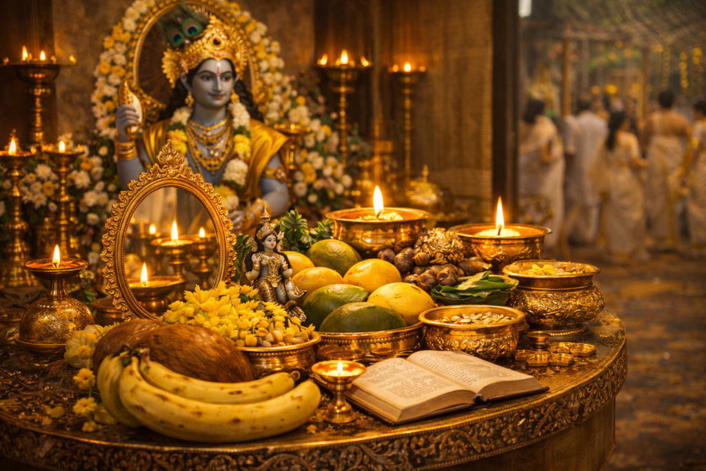 വിഷുവിനു ദിവസങ്ങൾക്ക് മുന്നേ തന്നെ കണി ഒരുക്കാനുള്ള സാധനങ്ങൾ നമ്മുടെ തൊടിയിൽ നിന്ന് പ്രത്യേകം എടുത്തുവയ്ക്കാൻ തുടങ്ങും. തേച്ചൊരുക്കിയ ഓട്ടുരുളിയിൽ അരിയും നെല്ലും ഉപയോഗിച്ച് പാതി നിറച്ച്, അലക്കിയ , മുണ്ടും, പൊന്നും, വാൽക്കണ്ണാടിയും, കണിവെള്ളരിയും, കണിക്കൊന്നയും, പഴുത്ത അടയ്ക്കയും വെറ്റിലയും, കണ്മഷി, ചാന്ത്, സിന്തൂരം, നാരങ്ങ എന്നിവയും കിഴക്കോട്ട് തിരിയിട്ട് കത്തിച്ച നിലവിളക്കും, നാളികേരപാതിയും, ശ്രീകൃഷ്ണന്റെ വിഗ്രഹവും വെച്ചാണ് വിഷുക്കണി ഒരുക്കുക.